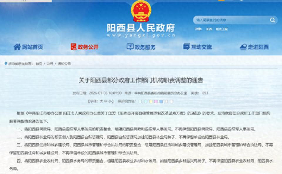 日前,广东省阳江市阳西县对外公布了多个部门整合消息。
