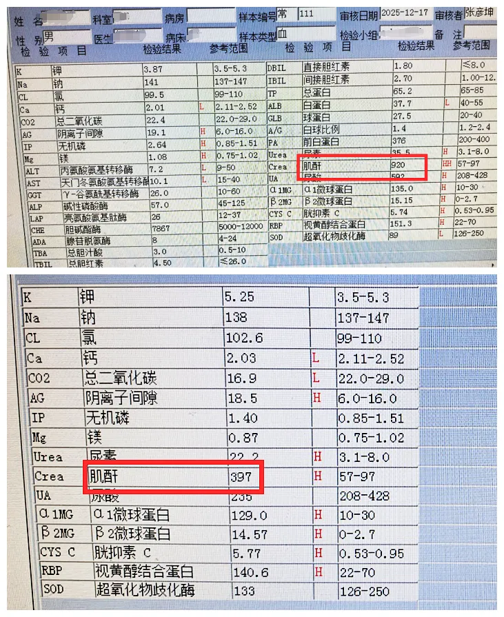 半年的时间出现了恶心呕吐等症状,过来进一步控制。当时入院整个人脸色蜡黄,嘴里氨味大。一查指标吓一跳,肌酐飙到了920,比半年前翻了3倍,尿素35.5,伴有严重贫血,血压高。