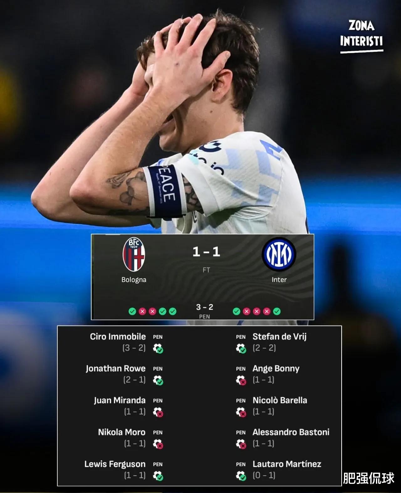 很多人认为这场比赛失利的罪魁祸首就是齐沃,可国米此前6次对阵博洛尼亚战绩为1胜3平2负,同样没有占到便宜,经验丰富的小因扎吉尚且如此,更别提菜鸟教练齐沃了!当然,齐沃肯定是有责任的,最明显的问题就是没有在赛前加练点球,明明90分钟战平就点球决胜负的赛制,而这恰恰又是球队的短板之一,却没有在赛前恶补,所以结果大家也看到了,连身经百战的巴雷拉、巴斯托尼主罚的点球质量都不高,也就别苛责年轻小将博尼了!
