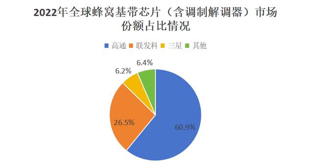 调研机构TechInsights发布报告显示,2022年全球蜂窝基带芯片(含调制解调器)市场中,高通常年霸占榜首位置,市场份额高达60.9%。