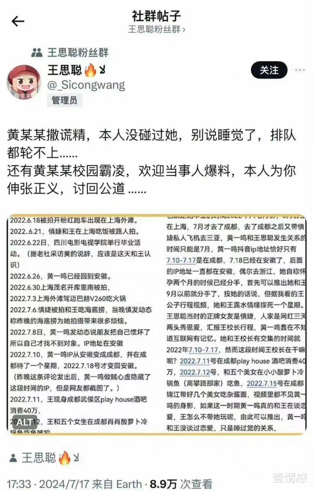 源于7月17号外网上有个昵称为“王思聪”的账号,发布了一条辟谣信息,措辞相当难听,简直把黄一鸣变得一文不值。