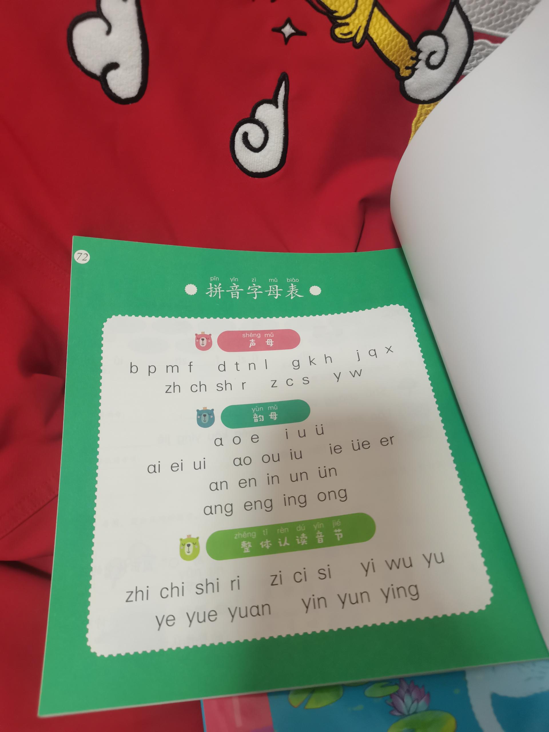 ●配会齐全这套书中,还有配套的练习册,很齐全。学完拼音后,再用练习册练一练,可不愁学不会。每章后面都跟着一个拼读的资料。有的是古诗,有的是儿歌。这本书的顺序和一年级的拼音教学顺序一样,而且都跟着几个趣味练习。难度系数由易到难,很适合学生龄前孩子。即便是一二年级的学生,想复习拼音的话,也完全可以用。因为这书中罗列了课本上没有但却必考的内容。家长辅导可算省心了,毕竟这样的规律性的内容很难找。这可真是学拼音的神器啊!●书中装帧精巧,纸张厚实。