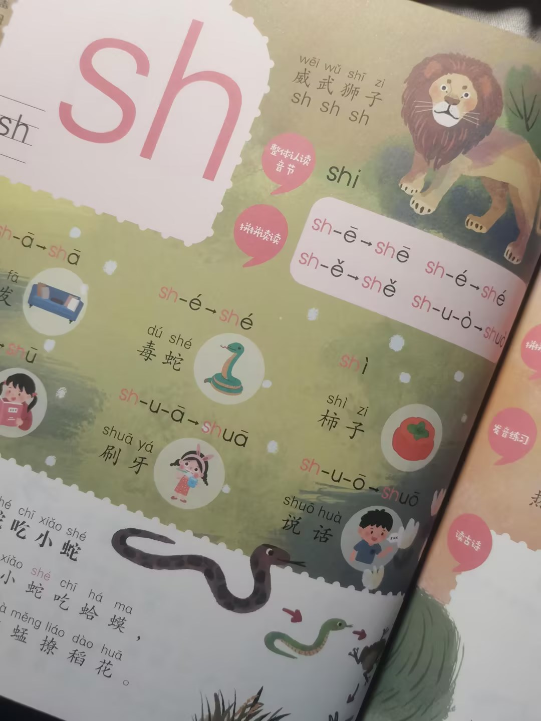 这本书所用的色彩很淡雅,每幅插图都与内容相符。比如学sh时图中是个狮子。这样就很容易记住了!而且书中的插画设计很用心,是个亮点,或淡雅或浓艳、或温馨或热烈,总是让人感觉到编辑大大的用心之处。