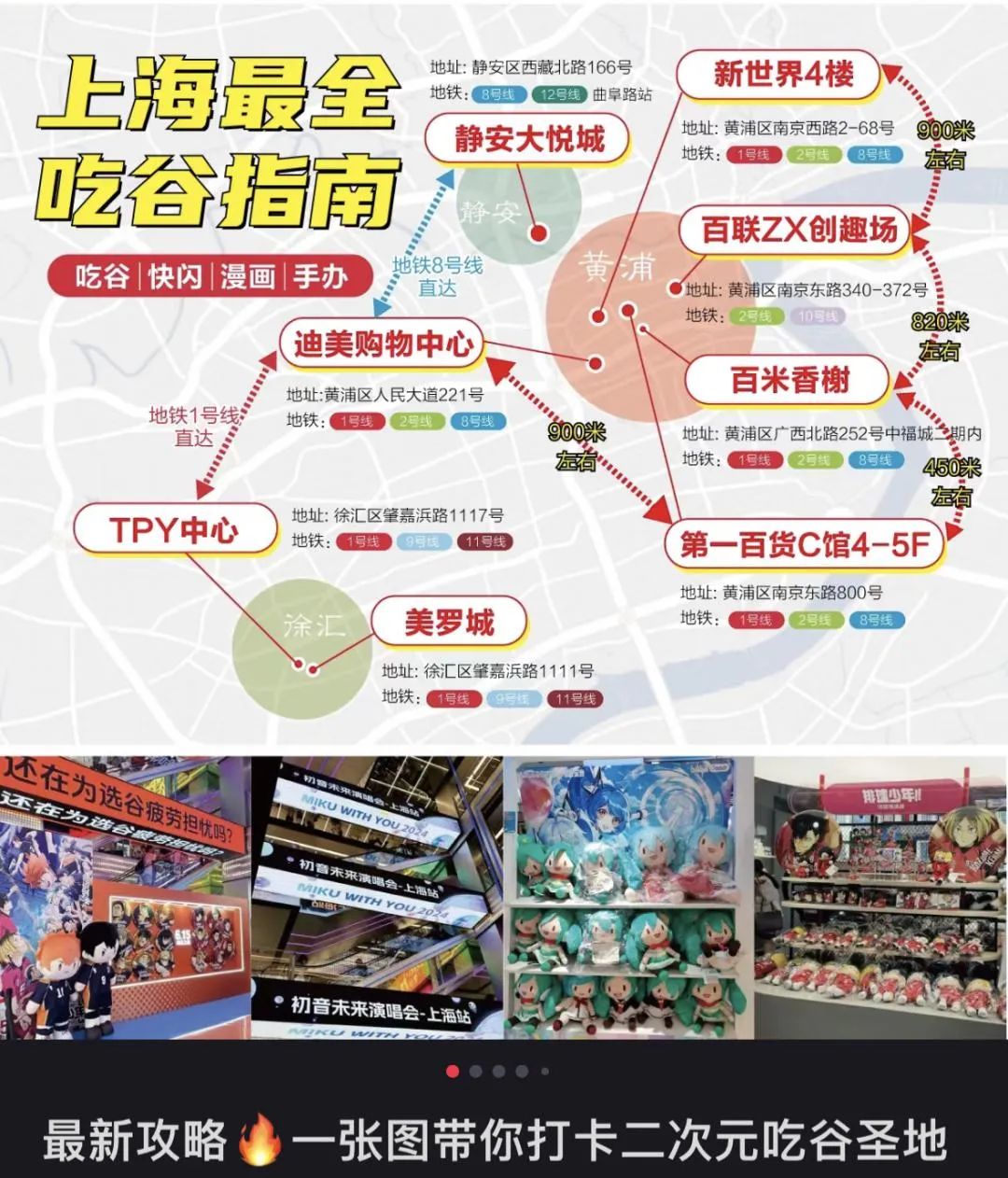 再来看线下,除了普通“谷店”人潮汹涌,“谷子”的出现也让许多商场再迎盛况。今年3月29日“chiikawa×miniso快闪店”全国首站在上海静安大悦城亮相,开展首日10小时内便创下了静安大悦城IP展单日最高销售记录,更有消费者自创“二次元吃谷地图”,把“谷店”捧为热门打卡点。