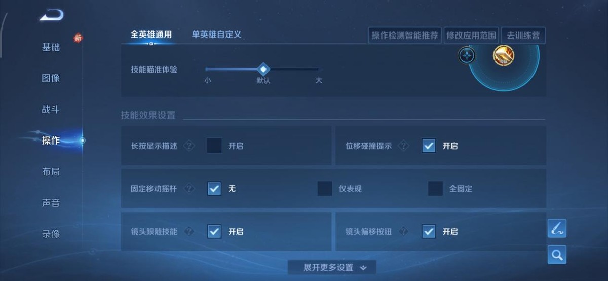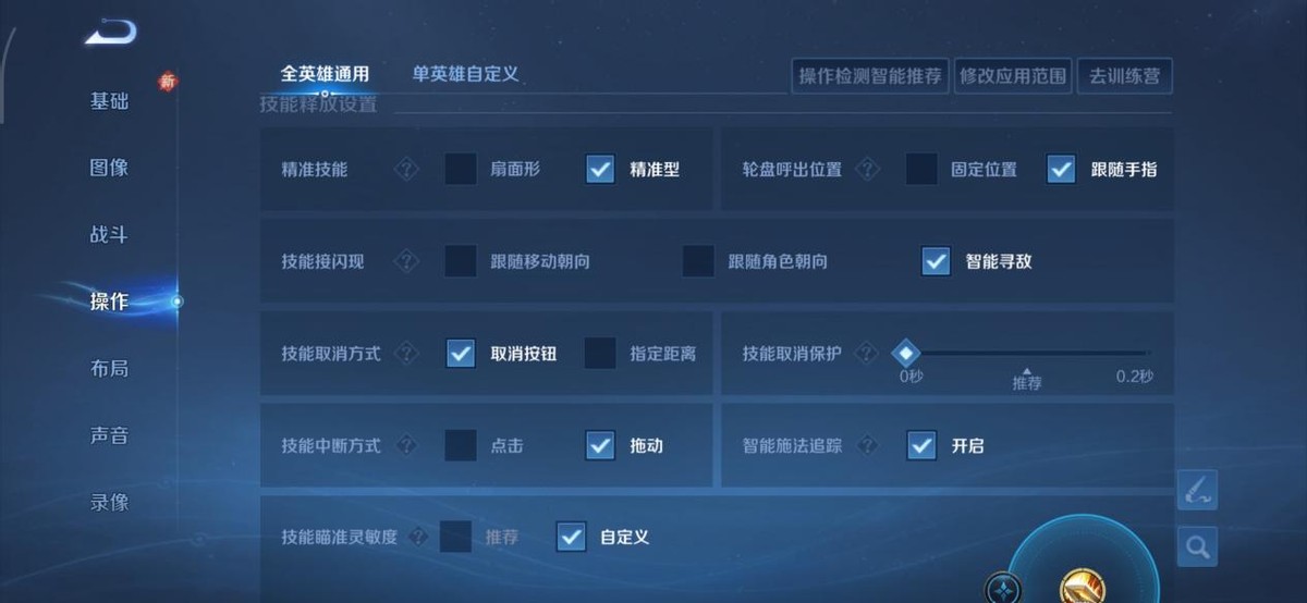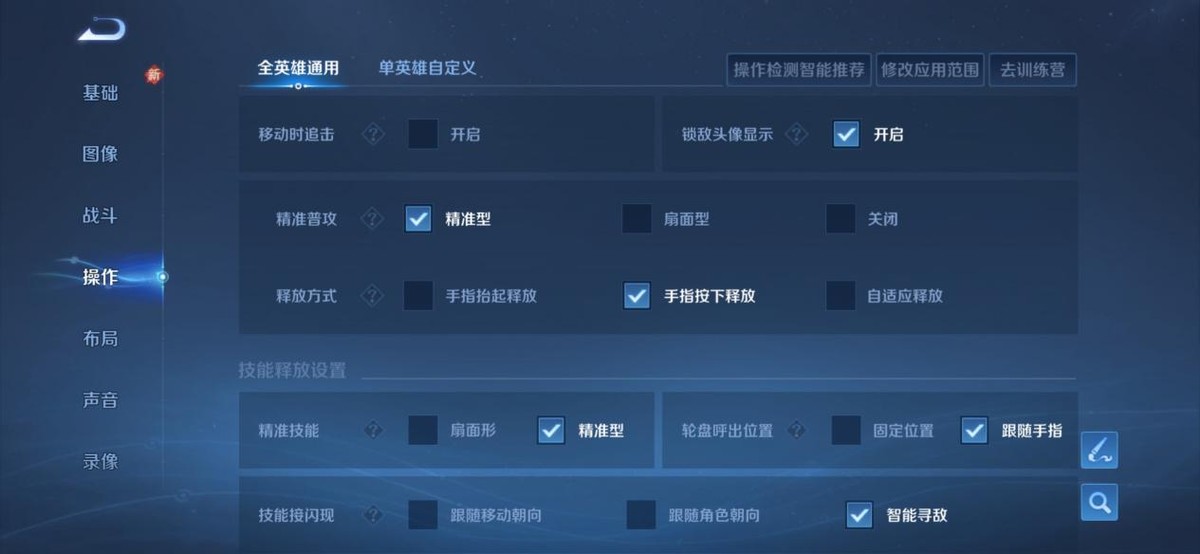 精准技能:选择“精准型”,还有轮盘的呼出位置选择“跟随手指”。这样更改完后可以让技能释放更加精准,减少反向技能的拉胯操作。