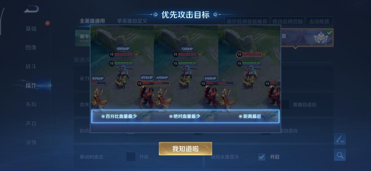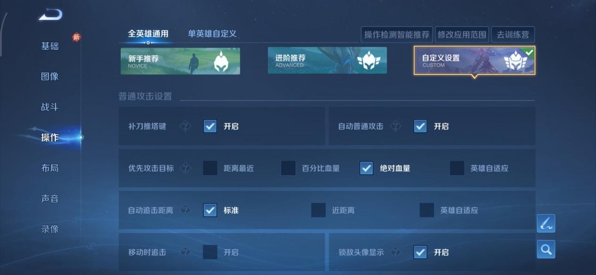 自动追击距离:一般推荐选择“标准”,但是需要空A的英雄例如:典韦、铠、韩信、墨子等,需要选择“近距离”,即使身边有敌方单位,也能实现原地空A。