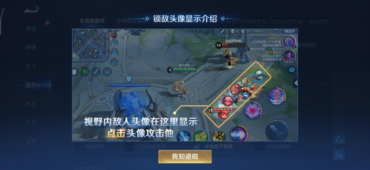 锁敌头像显示:推荐开启,在玩需要精准控制敌人的英雄时必点,例如张良、东皇等点控英雄。提前将技能拖到指定目标头像上,就可以接闪现后精准控制。同时点出头像锁敌,还能有效的提示附近有敌方单位。