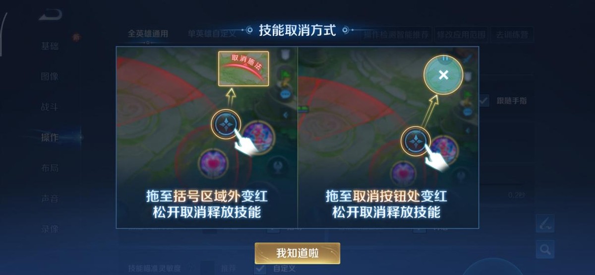 技能中断方式:选择“拖动”,当我们玩有持续技能的英雄时,例如安琪拉、铠、貂蝉等英雄,当我们开启大招后,再次拖动大招才会中断大招,可以有效的避免我们误触大招形成的断大。