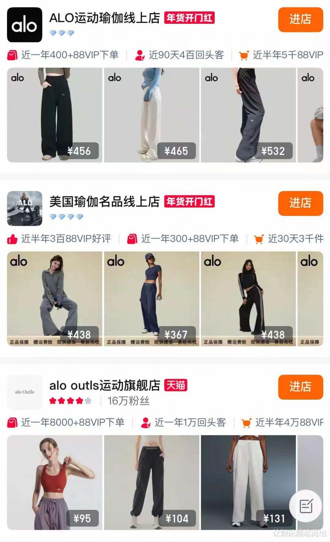 据时尚媒体KIKS统计,从2024年开始,抖音、淘宝、京东、拼多多等电商平台上,店铺名称里和「alo」沾边的线上店,在中国陆续开设的数量超过100家。这些店铺的运营主体多是自然人控股的小微企业和个体工商户。天眼查显示,它们均未注册「alo yoga」相关商标。