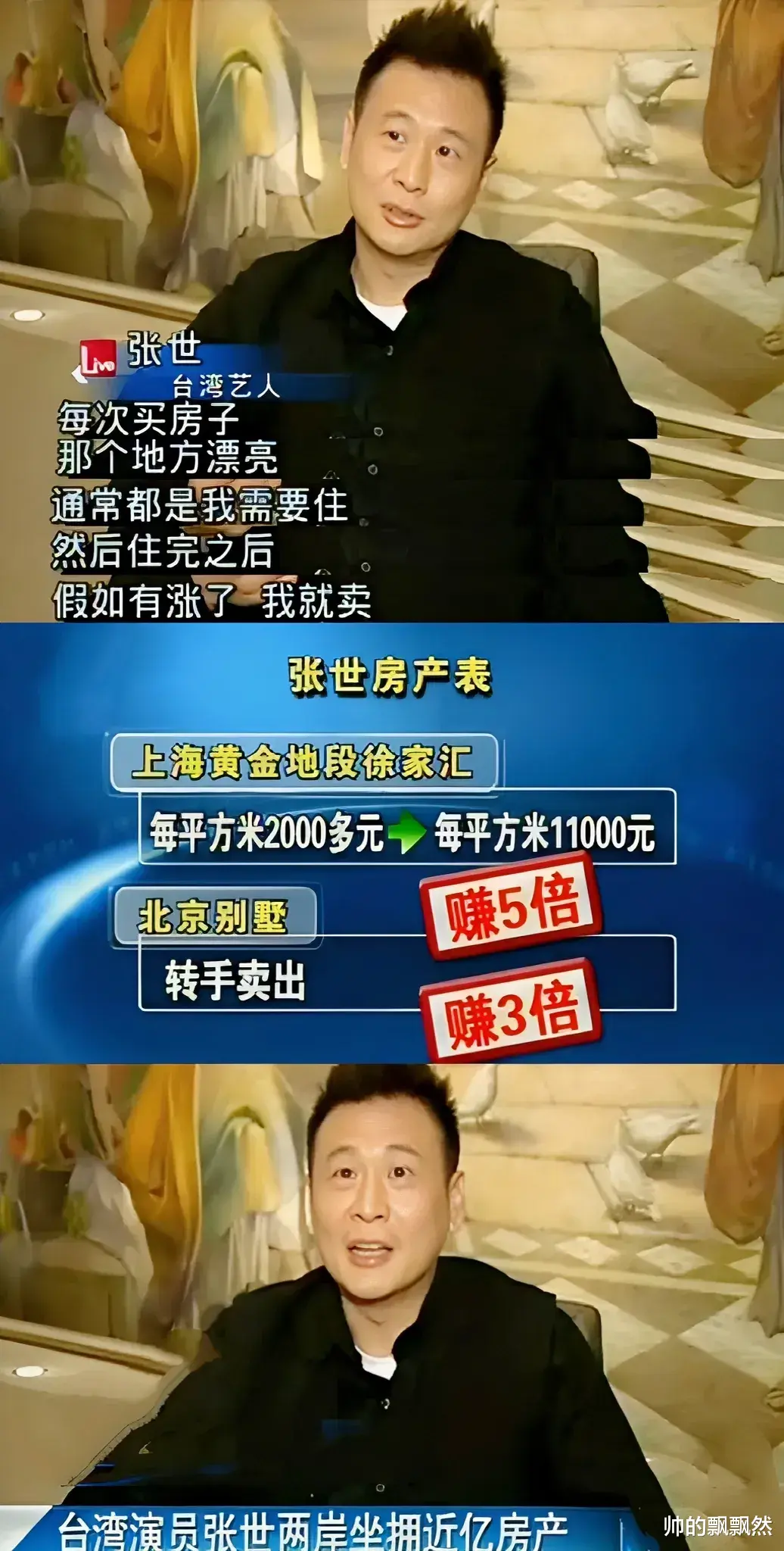 除去演艺圈的成就,张世也有着独特的眼光,在房地产崛起的那些年,他总能抢占先机买下房子,没多久房价疯涨,这也让他卖了出去,而且在上海、北京以及台湾等地有着近亿房产。