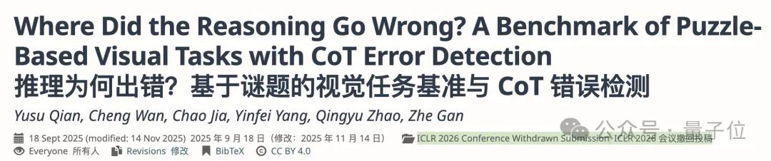 什么,GT的错误率可能高达30%?这个荒诞故事涉及的论文名为《Where Did the Reasoning Go Wrong? A Benchmark of Puzzle-Based Visual Tasks with CoT Error Detection》。
