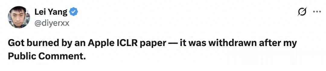 参考链接:[1]https://x.com/diyerxx/status/1994042370376032701[2]https://www.reddit.com/r/MachineLearning/comments/1p82cto/d_got_burned_by_an_apple_iclr_paper_it_was/[3]https://www.xiaohongshu.com/explore/6928aaf8000000001b022d64?app_platform=iosapp_version=9.10share_from_user_hidden=truexsec_source=app_sharetype=normalxsec_token=CBLEH7cvuVDNN78gtS-RUB8YQp0_GXstBHlQAk14v6t8I=author_share=1xhsshare=WeixinSessionshareRedId=NzxHOEQ6OTw6Pjw3Sj81SD1HQUk5R0lKapptime=1764289526share_id=c73caa18d27a408898ea99622f8e0360[4]https://openreview.net/forum?id=pS9jc2zxQz[5]https://openreview.net/pdf/e5917f72a8373c7f56b3cb9c0ac881d991294ee2.pdf