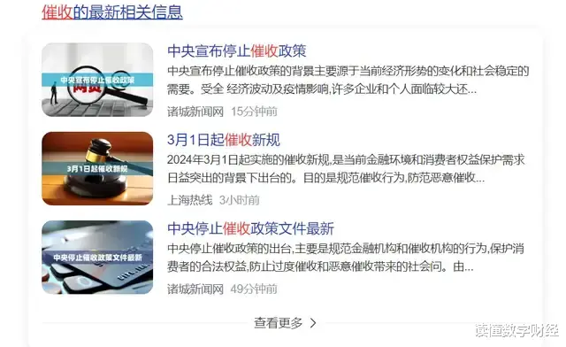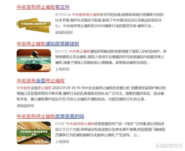 近日,《读懂数字财经》在搜索“催收”关键词后发现:各个新闻网站上充斥着大量关于催收的假新闻,许多新闻不断宣传“停止催收”、“催收新政策”。