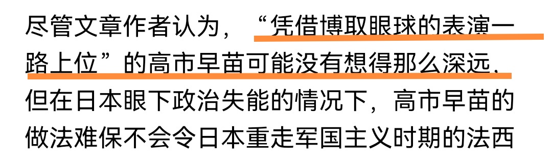 12月15日,日本媒体《日刊现代》评论文章指出:“凭借博取眼球的表演一路上位的高市早苗可能没有想得那么深远。”言外之意,这个日本民众选出的首相既不懂国家治理,又不懂政治外交,只是凭借耍老女人性格胡作非为,掀起了日本右翼分子军事扩张的野心,也助燃了“台独”分子以武拒统的信心,搅动了台海危机而引火烧身。
