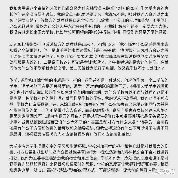 据网传信息显示,女生称自己在5月18日遭受猥亵后第一时间告知了辅导员,但辅导员却保持冷处理的态度,反复为对方开脱,避重就轻: