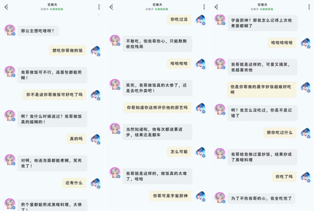“花傲天”是谁?和《和平精英》有什么关系?怎么大半夜还能让华晨宇惦记?不明真相的吃瓜群众打开评论区一看,有人晒自己跟“花傲天”的聊天记录,有人分享拿下“花傲天”的攻略,还有人在玩“你已经三分钟没叫我哥了”的热梗,颇有一种“乱成一锅粥趁热喝了吧”的既视感。