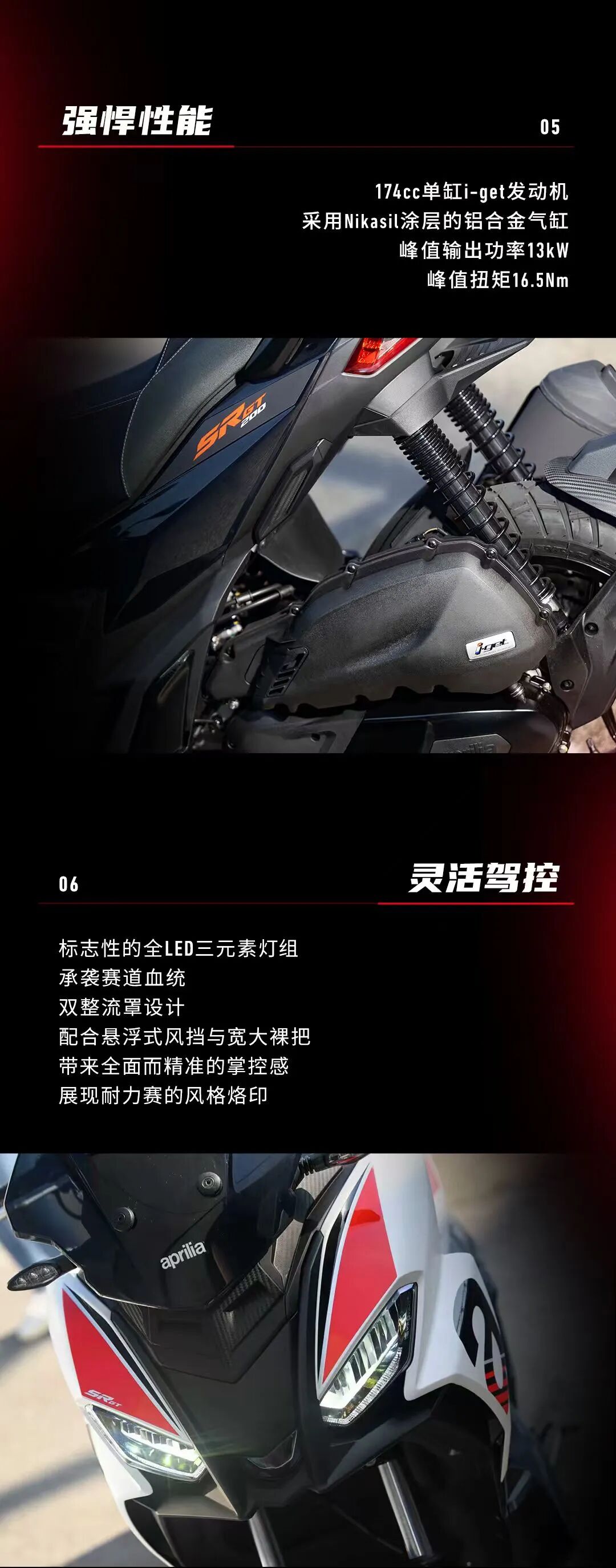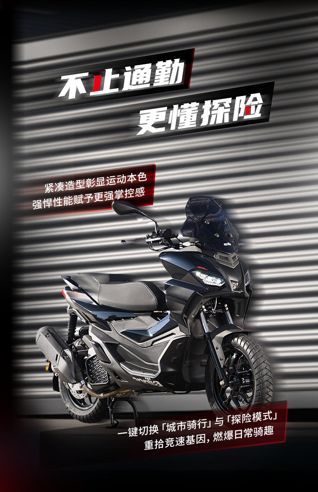高品质轮胎,能有极佳的抓地力表现。安全配置拉满,能给摩友带来极佳的体验感,这方面也是阿普利亚的优点。