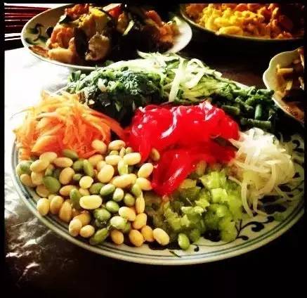 中间的是红粉皮,我们有喜事的时候就会吃!怎么样?全不全?天津人吃捞面尤其注重时鲜蔬菜相佐,土豆丝、洋白菜丝、小水萝卜、蒜苗、菠菜、绿豆芽、胡萝卜丝、白菜丝、黄瓜丝、豆角丝、韭黄等等要抢鲜吃,而且还要配上煮青豆、煮黄豆,“卫嘴子”们认为这样待客才够档次。