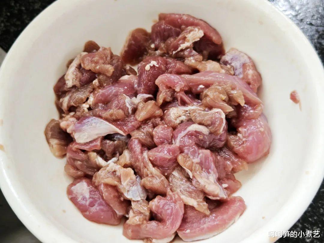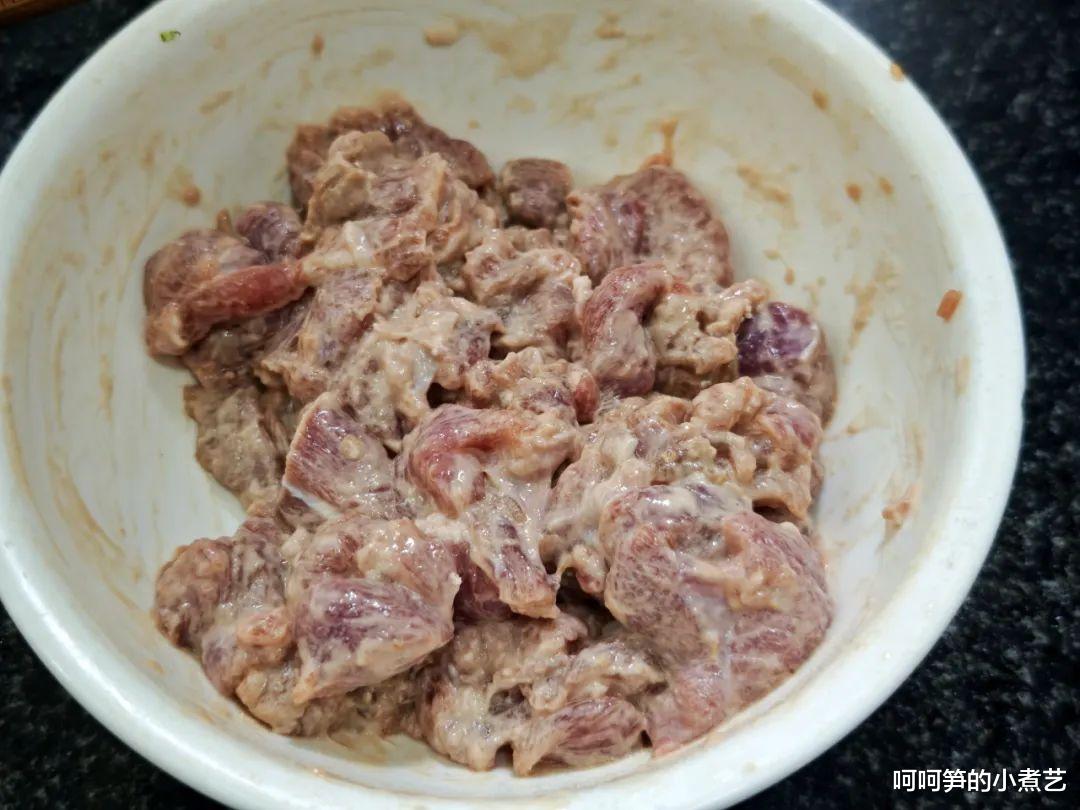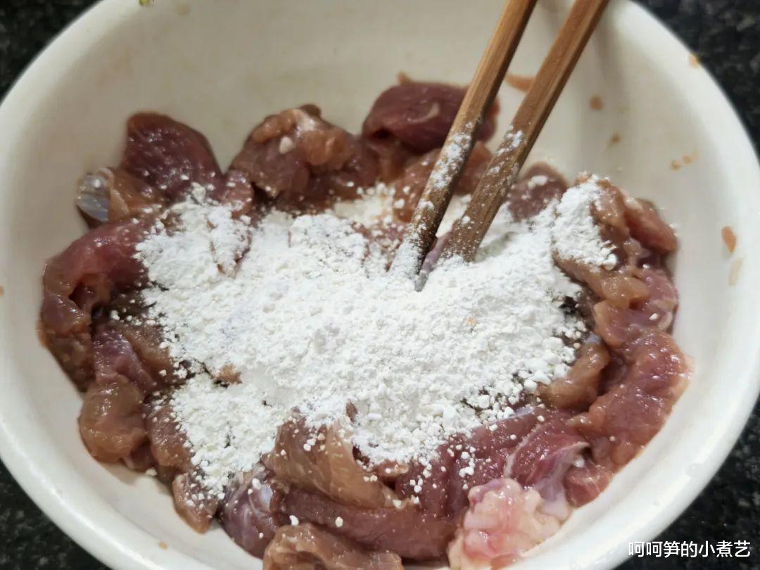 再加入适量的地瓜淀粉抓均匀,保证每片肉都裹上淀粉。