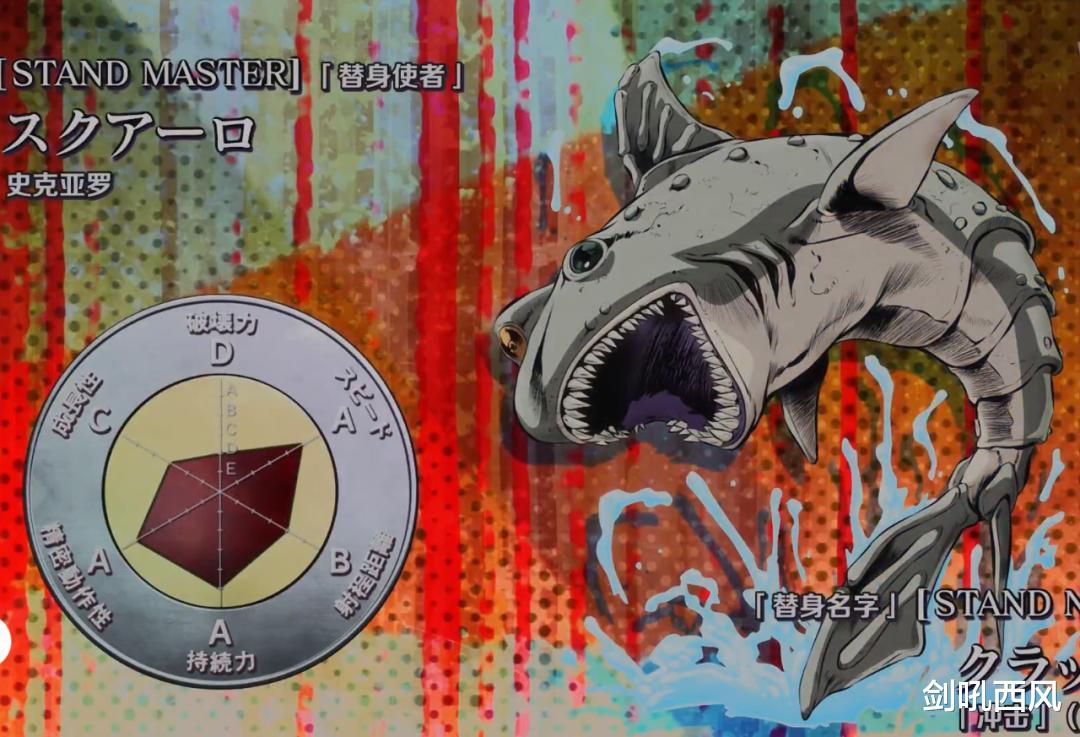 其能力是操控“鲨鱼”替身在不同未封闭的液体之间进行瞬移。(血液、泪液、汗液也是液体)