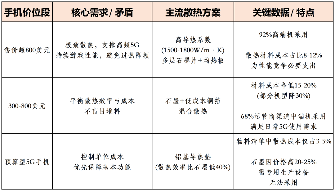 更现实的是,不同价位段5G手机还面临专属散热困境。据Pmarket Research报道,高端机超薄设计会压缩12%—15%散热空间,影响散热效果;中端机受5G基础设施不完善制约,部分市场对先进散热的需求较弱,厂商缺乏大规模投入的动力,仅以满足基础使用需求为目标;预算机因成本敏感采用廉价散热材料,5G高负载场景下CPU降频概率增加22%,性能稳定性大打折扣。