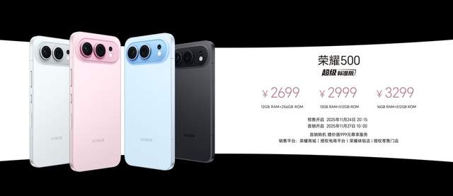 11月24日,荣耀在杭州正式发布荣耀500超级标准版与荣耀500超级Pro版,分别搭配骁龙8s Gen4和骁龙8至尊版芯片平台,两款新品的起售价分别为2699元、3599元,目前已经开启预售,并于11月27日10:00全渠道正式开售。