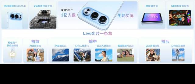 在影像体验层面,荣耀500系列带来档位超全实况体验,针对Live实况拍摄场景,行业首发前后置Live人像,让live帧帧有虚化,帧帧有美颜,帧帧有氛围。荣耀500系列还带来行业超全的氛围感胶片色彩,共有6种胶片Live任意挑选。同时,Live路人消除也让动态瞬间免受路人干扰,时刻主角。此外还支持4K转Live,轻松将4K视频转成4K Live分享朋友圈。