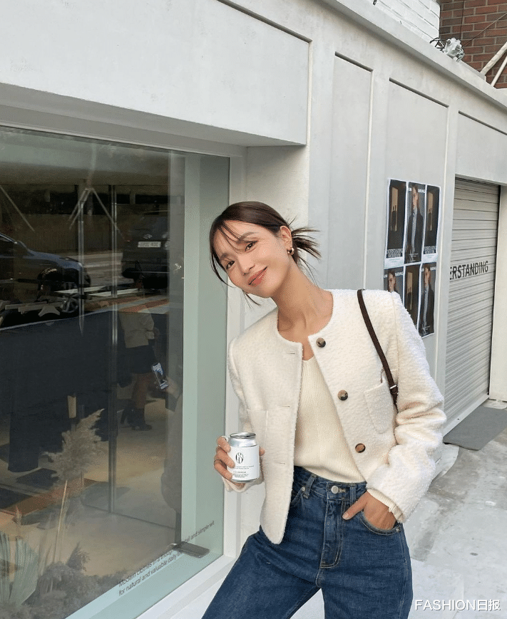 小香风外套每年都有白色的单品,细节设计可能有所不同,不过面料和整体轮廓都在保持着经典的设计,小香风外套给人的端庄优雅,高贵精致的美感一直是所有女生追求的风格调性之一,特别是这套短款小香风外套。