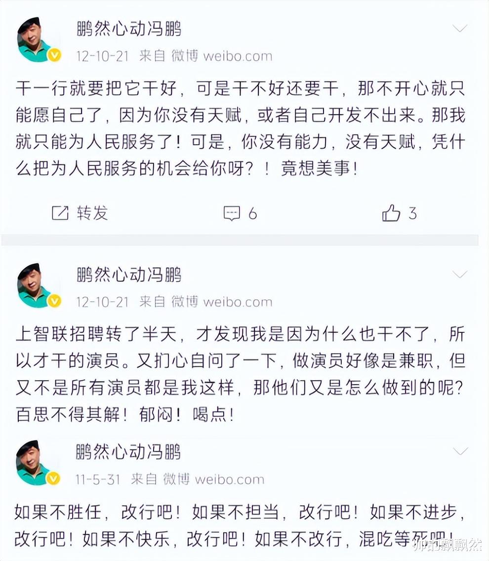 对于演艺圈,冯鹏内心有些绝望,甚至还迷茫起来了,可以看看他在那几年的动态。
