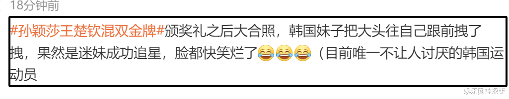 另外还有网友质疑到韩国女选手在合影时,就站在王楚钦身后,还用手拍了拍王楚钦后背,让他更靠前一点,这个举止十分圈粉。而且这位韩国女选手全程保持友好的笑容,昨天和孙颖莎比赛的时候就一直笑,友好的态度收获了不少粉丝。
