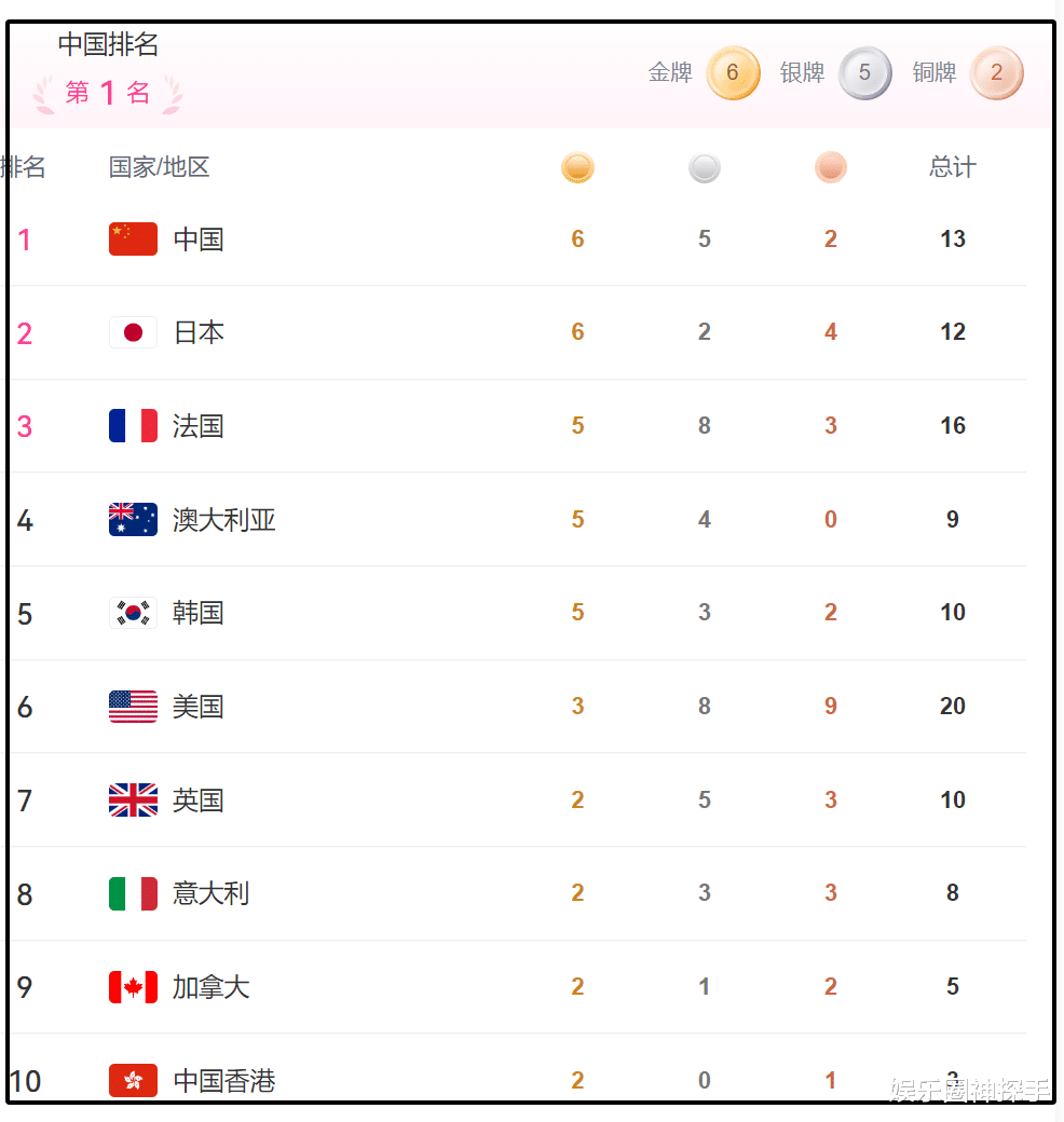 截止目前,中国队以6金5银2铜的成绩位列巴黎奥运奖牌榜第一名,接下来的分别是日本、法国、澳大利亚和韩国。美国已经跌出前5名,中国香港位列第10名。