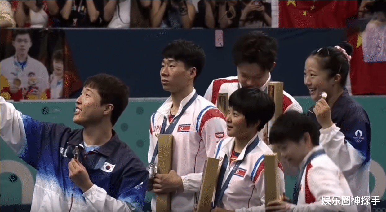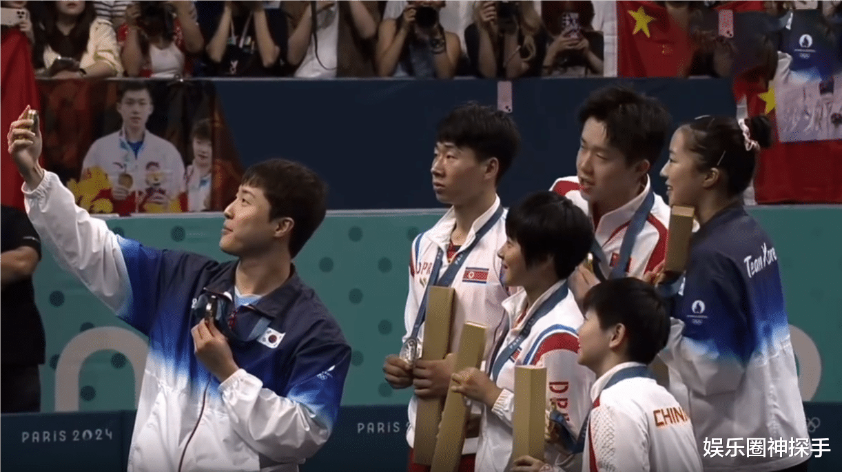仔细看冠亚季中自拍的这个画面,韩国选手站在前面举着手机,中国和朝鲜选手站在中间,韩国女选手则站在后面,大家都拿着奖杯笑得十分开心。
