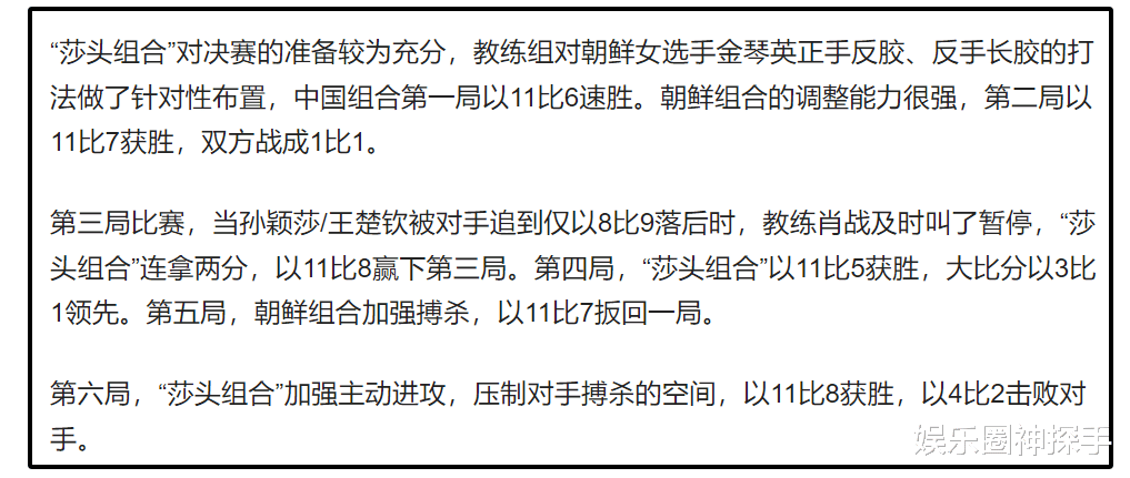 回顾下这场比赛的过程,实在太过惊险。虽然“莎头组合”对决赛的准备已经十分充分,但是朝鲜的“神秘之师”实力也不容小觑,他们一路紧追猛打,让“莎头组合”一刻都不敢松懈。每次朝鲜队拿分,朝鲜教练总是露出神秘的微笑,让现场的气氛更加紧张了。