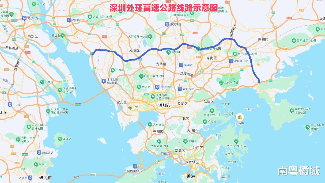 据悉,深圳外环高速西起宝安沙井,接广深沿江高速,连接宝安区、光明区、龙华区、东莞市、龙岗区、坪山区、大鹏新区,终至大鹏坪西路,全长94公里,其中深圳段77公里分三期建设,全线双向六车道,设计时速80—100公里,估算总投资约294亿元。项目2006年纳入规划,2014年一期开工,2020年12月一期(宝安—龙岗)通车,2022年1月二期(龙岗—坪山)通车,目前已经成为机荷、惠盐高速之外又一条东西向货运大动脉。