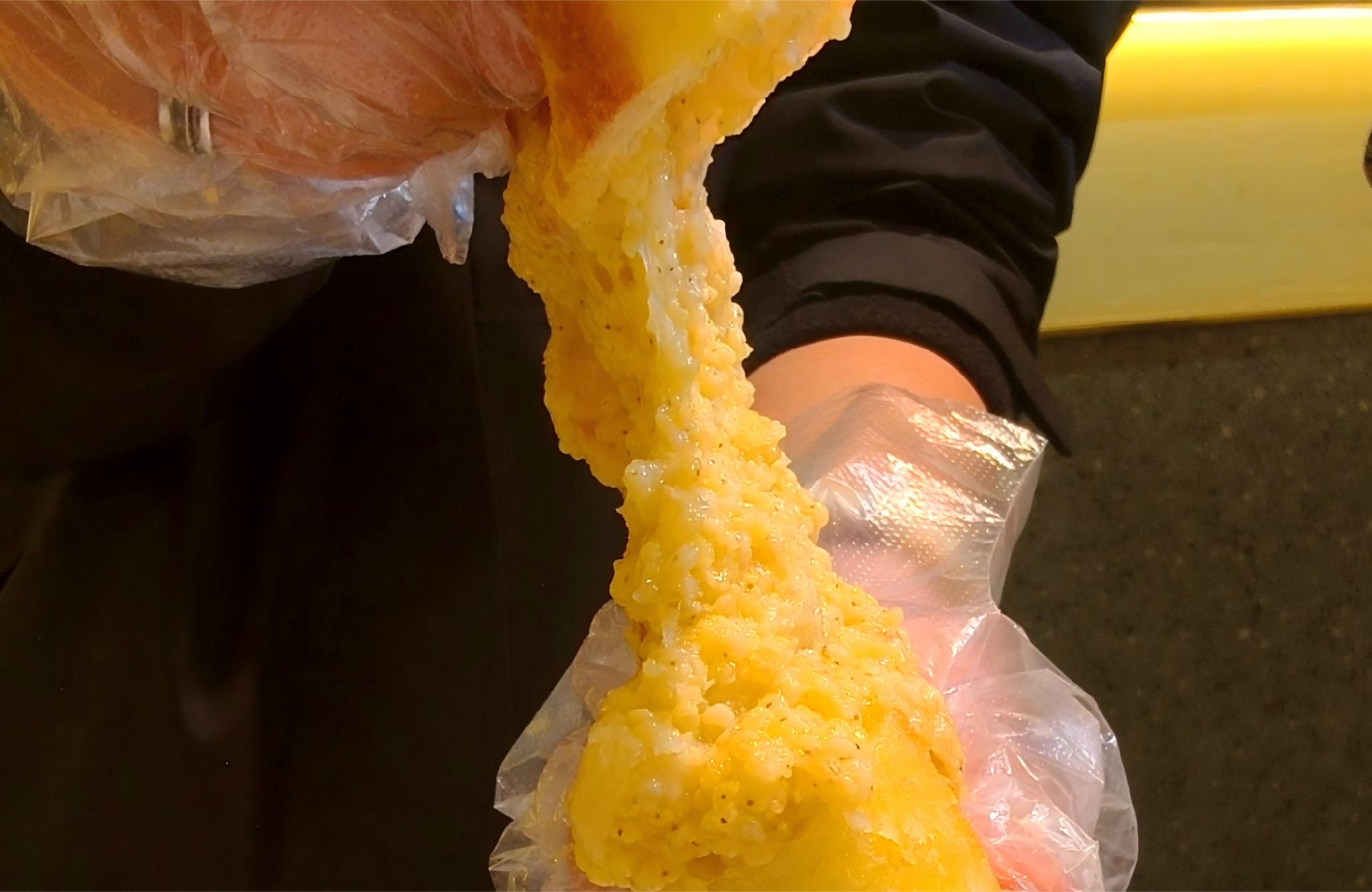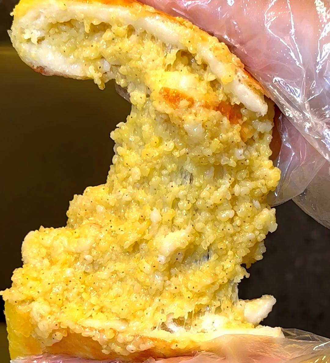 现烙现卖的米香太上头,我家娃连吃 3 块,白面皮煎得焦香,黄米馅软糯香甜,拉丝效果绝了!
