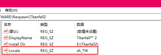 以泰坦陨落2为例,在注册表中找到 HKEY_LOCAL_MACHINE\SOFTWARE\Respawn\Titanfall2,点击locale,然后把数据改为zh_CN或者zh_TW。