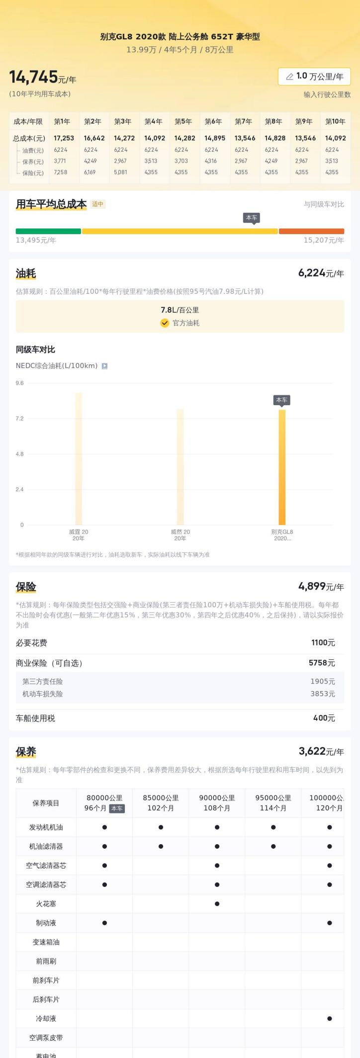 此外,购买二手车还需要考虑后续的用车成本。除了油费,还需要考虑保险、保养、维修等费用。根据估算,这辆GL8每年的用车成本大约在1.5万元左右,当然,实际费用支出与个人用车习惯和维护保养方式有着直接关系。