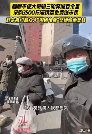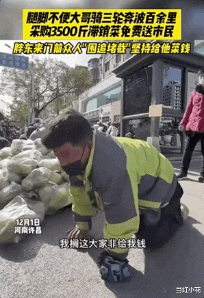 大家都在用自己力所能及的方式,去帮助这对在生活边缘苦苦挣扎的父子。人们戴着口罩,看不到什么表情,也没有多余的言语。整个车厢里,只剩下一位父亲地抽泣和不住地道谢声……世事艰辛,也许它会一次又一次让你绝望。但总有一些温情,让它没有失去最后的亮色。03河南许昌。大街上,一群清晨采购的大爷大妈拉着一位双腿残疾的小伙儿,硬是往他手里塞钱。小伙儿拼命挣扎:“我搁这大家非给我钱,我不搁这儿了。”说着,就要骑着自己的三轮车闯出众人的围堵。