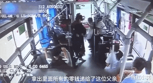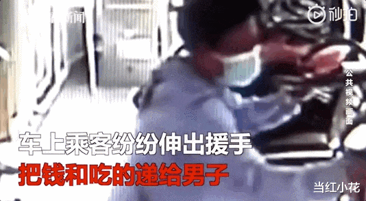 一位大哥从车厢尾部快步走上前,将食物和零钱塞到了男人手中;