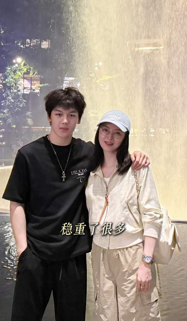 照片中他已经比妈妈高出半个头了,长的也很像妈妈,完全不像小时候一样肉嘟嘟的了,现在的他高大帅气,一只手搭在妈妈的肩头,站在他身边安全感十足。