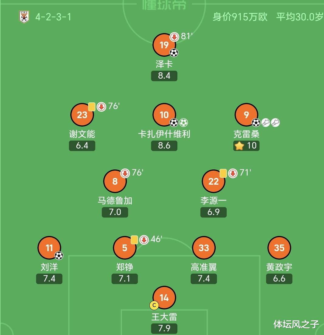 在泰山队其他首发球员中,卡扎伊什维利得到了8.6分,泽卡8.4分,王大雷7.9分,刘洋和高准翼均7.4分,郑铮7.1分,马德鲁加7.0分,李源一6.9分,黄政宇6.6分。