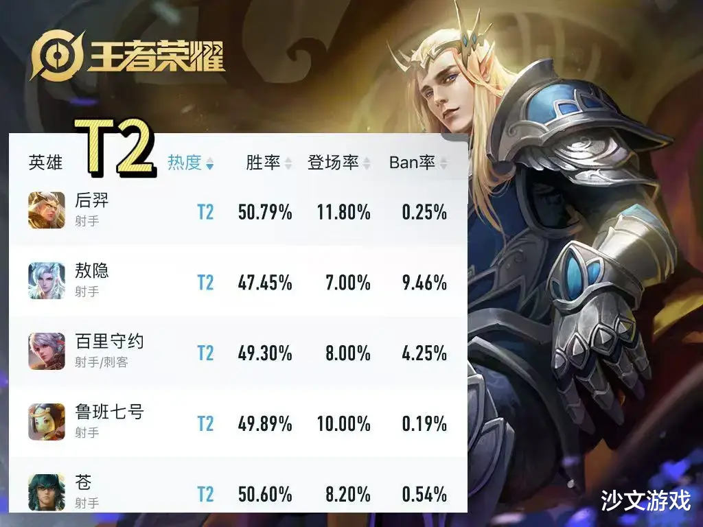 排在巅峰赛射手热度榜T2的英雄有后羿、敖隐、百里守约、鲁班七号、苍。