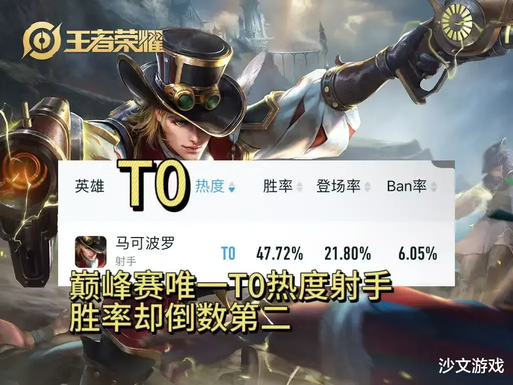 首先,排在巅峰赛射手热度榜T0的英雄只有马可波罗,他也是巅峰赛射手中唯一的热度T0英雄。