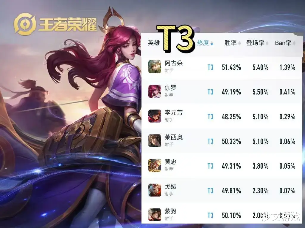排在巅峰赛射手热度榜T的英雄有阿古朵、伽罗、李元芳、莱西奥、黄忠、戈娅、蒙犽。