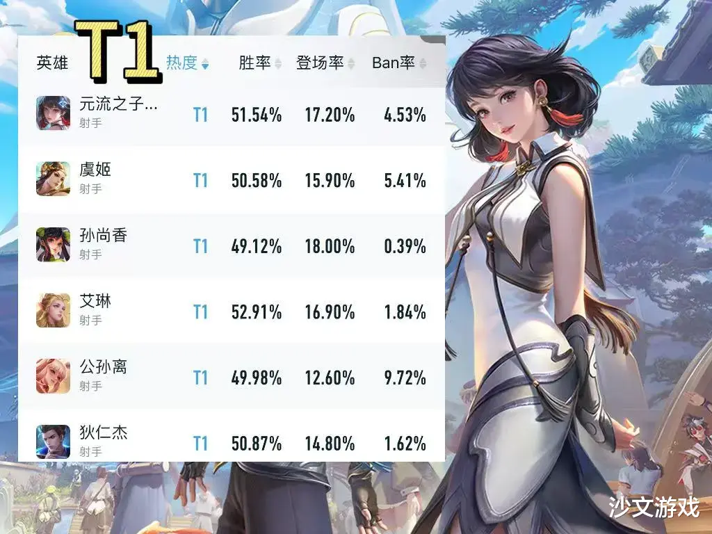排在巅峰赛射手热度榜T1的英雄有元流之子(射手)、虞姬、孙尚香、艾琳、公孙离、狄仁杰。