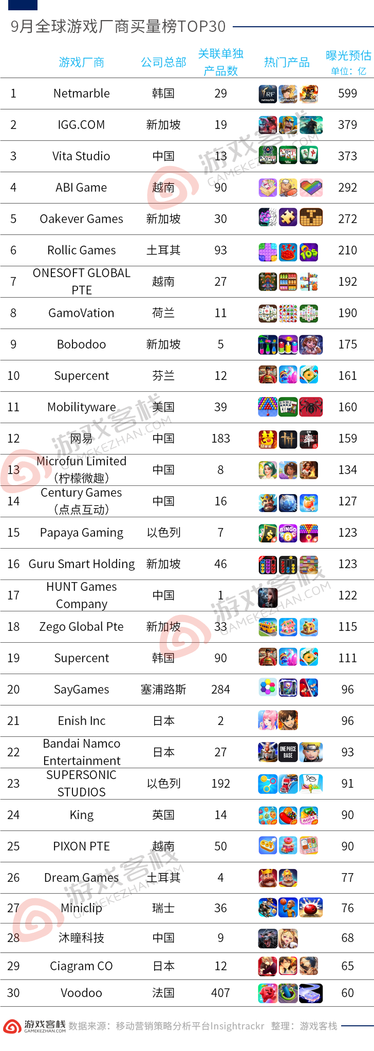2、此次榜单中,东南亚厂商表现突出。此次共计8家厂商上榜,其中新加坡就有5家厂商,它们分别是:TOP2 IGG.COM,曝光预估379亿;TOP5 Oakever Games,曝光预估272亿;TOP9 Bobodoo,曝光预估175亿;TOP16 Guru Smart Holding,曝光预估123亿;TOP18Zego Global Pte,曝光预估115亿。