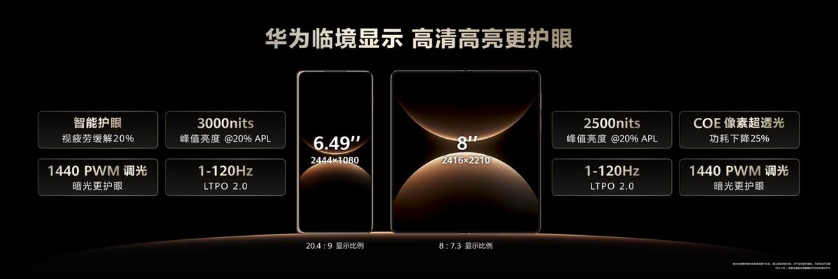 在折叠屏的交互核心——屏幕方面,华为Mate X7搭载华为临境显示技术,让内外双屏均具备高清晰度、高亮度、高刷新率与高色彩保真度的卓越特性。具体来看,其6.49英寸外屏分辨率达2444×1080,峰值亮度高达3000nits;8英寸内屏分辨率达2416×2210,峰值亮度为2500nits。双屏均支持1-120Hz自适应刷新率,可根据内容自动调节,兼顾流畅与节能。得益于此,无论是在户外强光下浏览内容,还是在室内暗光中观看影片,华为Mate X7都能呈现出细腻、鲜艳且流畅的视觉体验,彻底解决了以往折叠屏“外屏不够用、内屏不好看”的用户痛点。