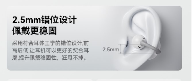 这款耳机在佩戴方面也花了小心思,2.5mm 错位设计做成前高后低的样子,戴得特牢固。12 度弧面耳托能给耳朵提供一个合理的支撑,贴得严实,单耳才 4.5g,轻得没负担,戴着贼舒服。