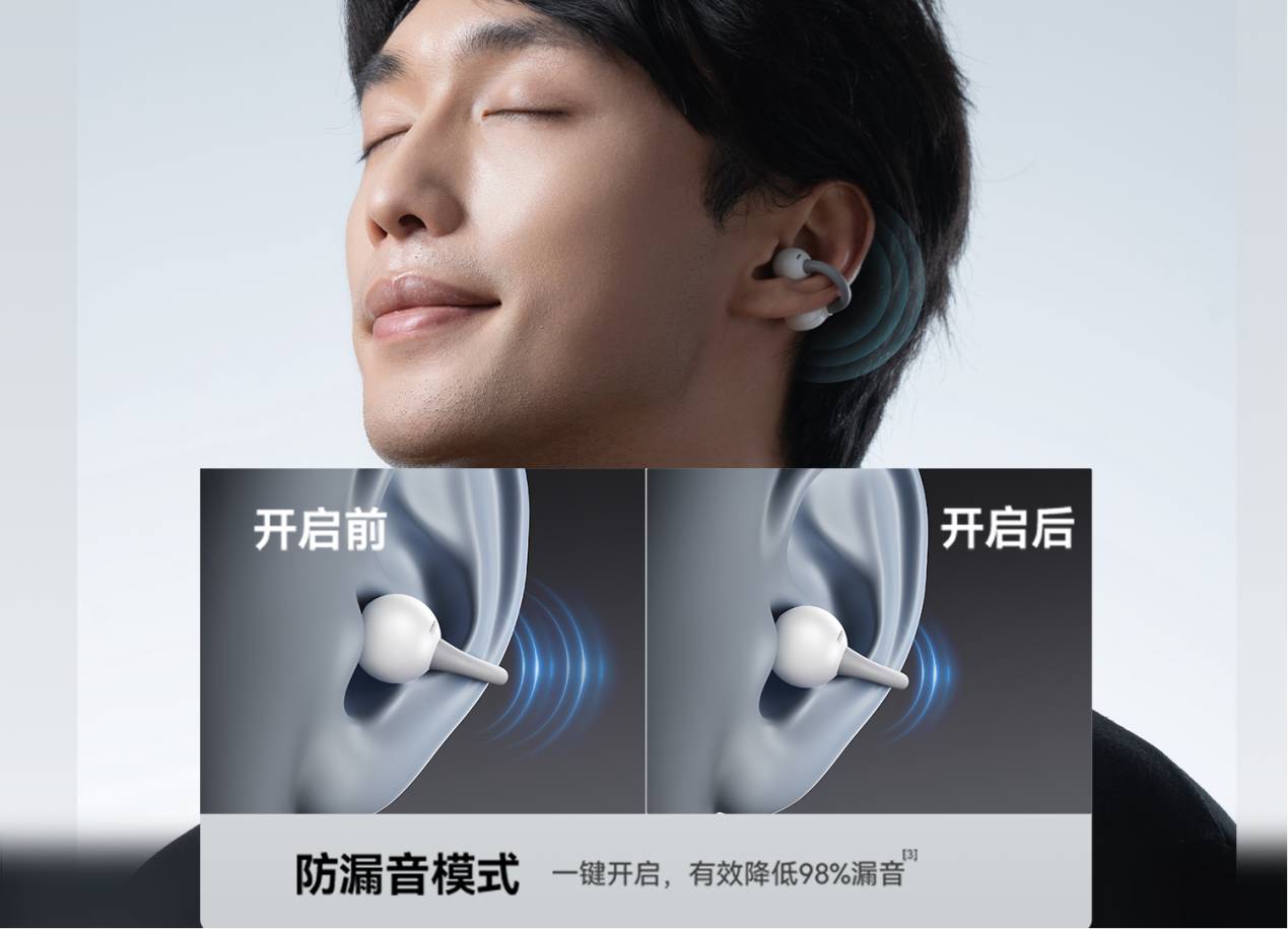 它在性能方面也没短板,自研的防漏音模式一键打开就管用,解决了开放式耳机漏音的老问题。蓝牙 5.4连得又快又稳,双麦 ENC 降噪,打电话听得清清楚楚。还有HBC 智慧双联,一副能拆成两副用,跟朋友分享超方便。综合续航 8+24 小时,IPX5 防水,日常通勤、运动戴都够用。说实话,百元价位能有这配置,真的捡到宝了,性价比绝了!