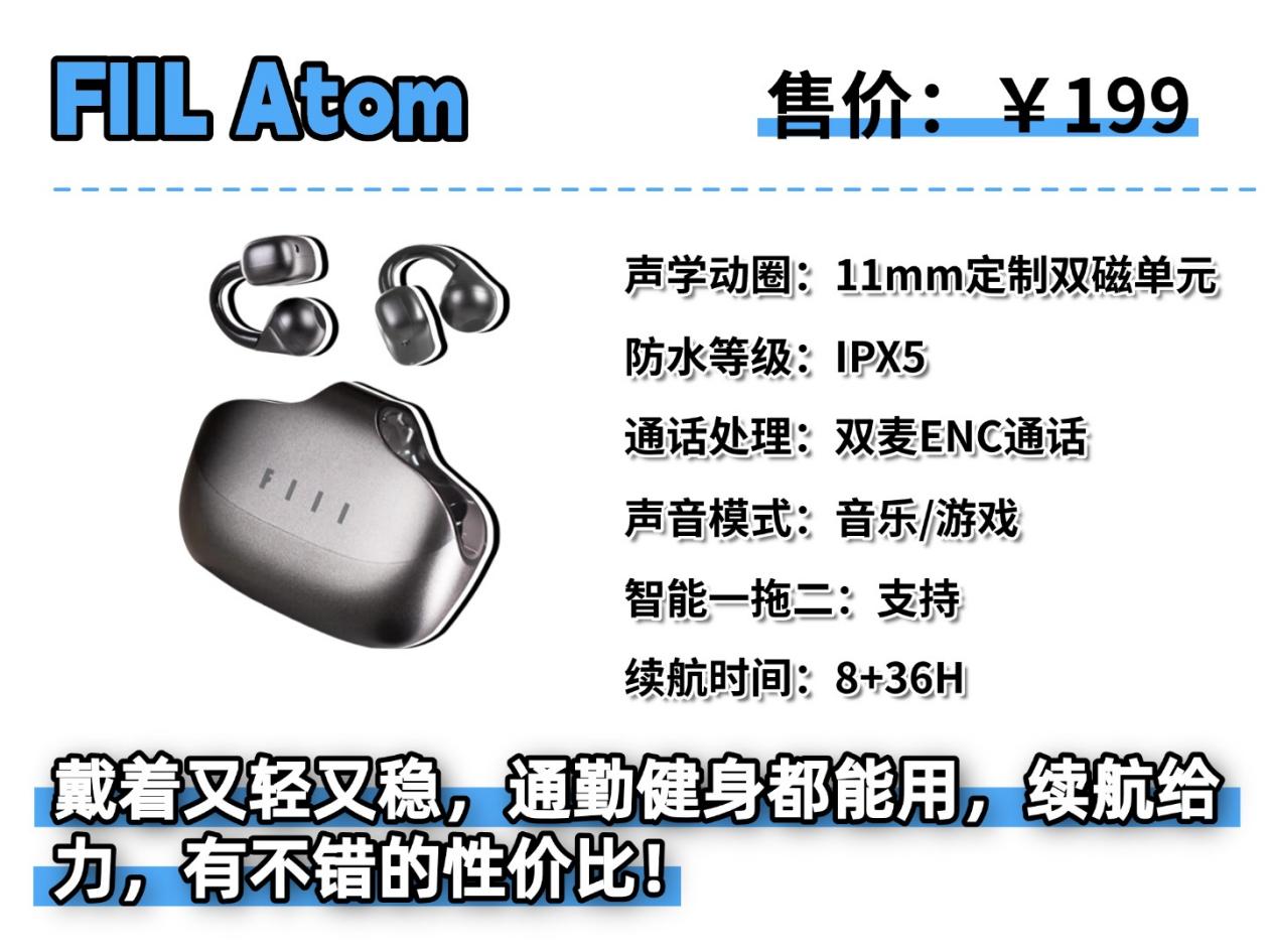FIIL Atom售价:199元推荐理由:戴着轻松,续航也够用,日常使用完全不担心,性价比不错。